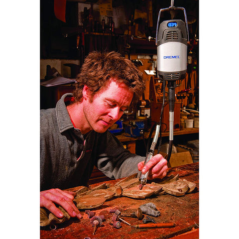 The Dremel Fortiflex is a high quality precision tool, consisting of a powerful hanging motor (300W), a patented heavy duty flexible shaft, an exchangeable precision hand piece and a foot pedal for variable speed control (0-20.000rpm). This makes it the ideal tool for stationary projects, like woodworking, jewellery making, stone working, car restoration, or any project where a combination of power and precision is required. The Dremel Fortiflex: power meets precision.