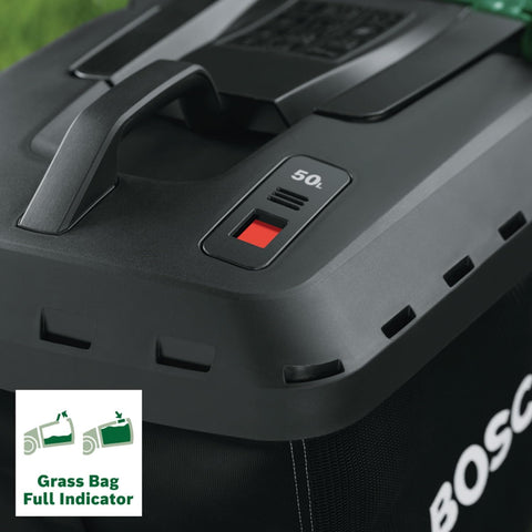 Maintain big, beautiful lawns and save time with the efficient, powerful 44 cm cutting performance of the corded Bosch AdvancedRotak 44-750 lawnmower. Several features boost ease and convenience while mowing; Ergoflex handles for comfortable manoeuvrability, and the grass cutting height can be adjusted to 7 different settings, from 25 mm to 80 mm, with the push of a button. For neat and tidy lawns, a 50-litre fabric bag collects grass clippings while an indicator lets you know when the bag is full. Once the lawn is finished, the collapsible grass bag and the Ergoslide allow for compact mower storage. -